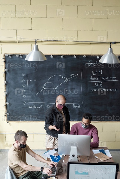 Два коллеги в масках обсуждают онлайн-данные перед монитором компьютера