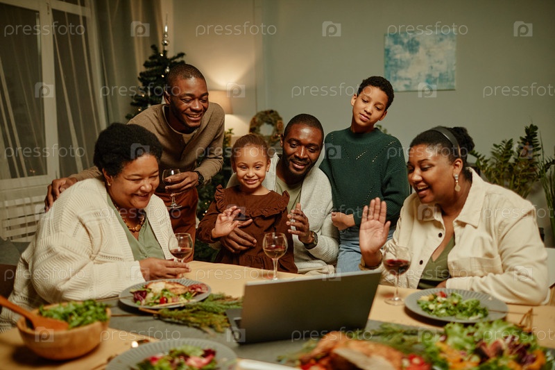 Американская семья, размахивающая видеочатом с афроамериканцами