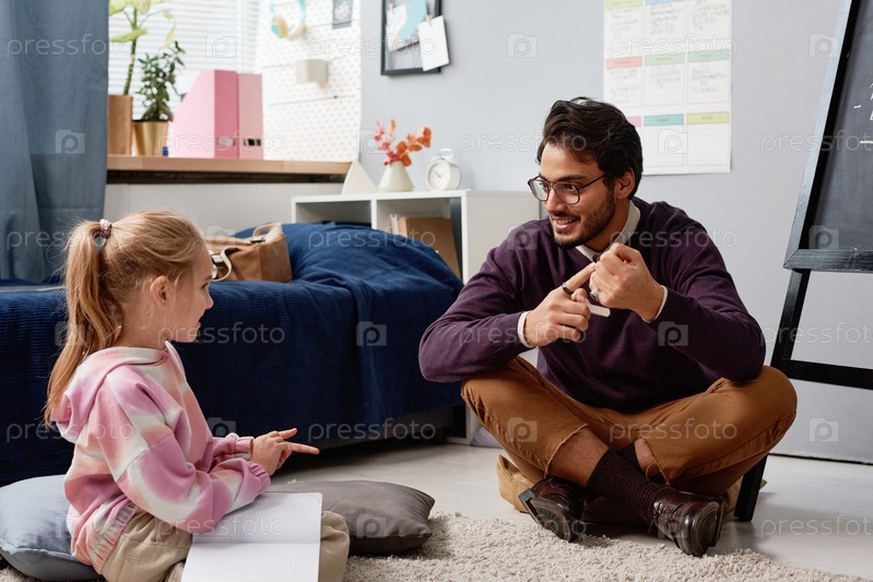 Улыбающийся молодой преподаватель из Ближнего Востока сидит со скрещенными ногами на полу и указывает пальцами, пока учит девочку считать