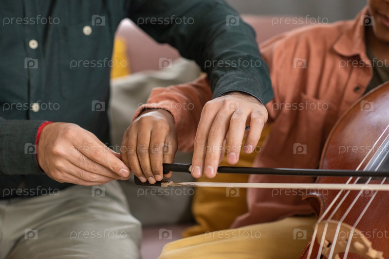 Руки учителя музыки и его ученика, играющего на виолончели