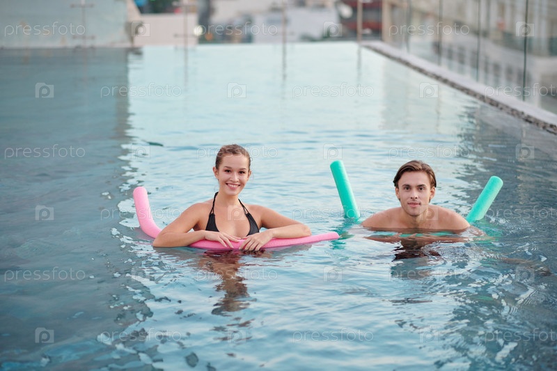 Пара плавает с бассейнными лапшами