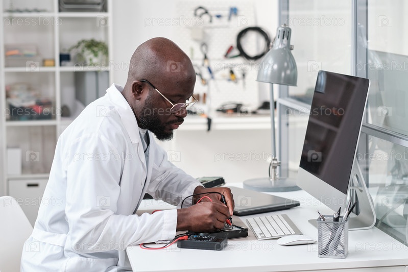 Серьезный молодой африканский мастер по ремонту в белом пальто сварной платы