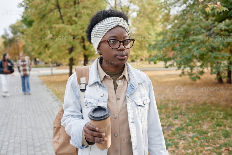 Женщина с кофе ходит в парке