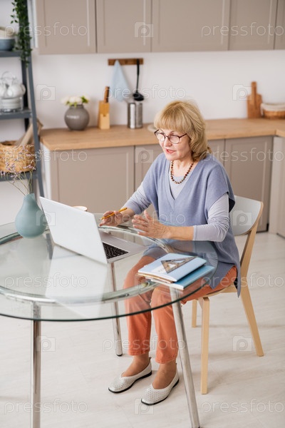 Уверенная в себе зрелая женщина, общающаяся на видеочате