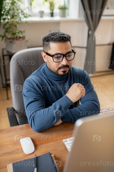 Мужчина-учитель в повседневной одежде и очках смотрит на компьютерный экран