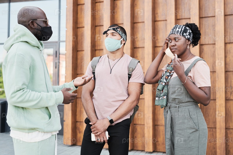 Молодая женщина в маске во время встречи с друзьями