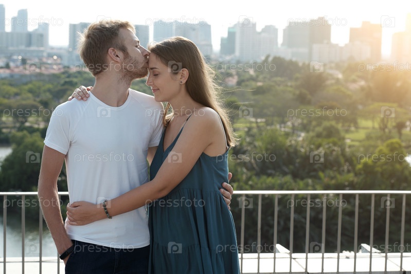 Мужчина обнимает девушку и целуется на лбу