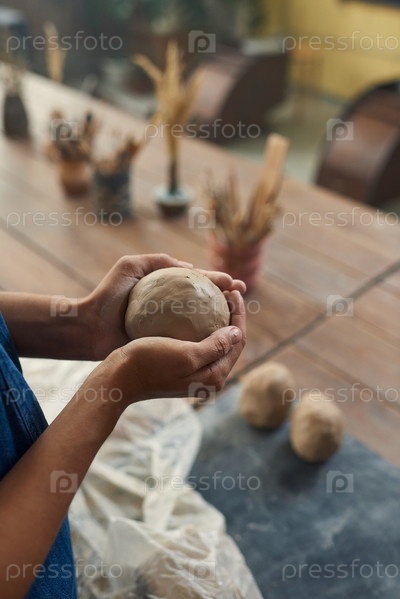 Молодая ремесленница измельчает кусок глины, готовя ее к дальнейшей работе