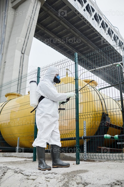 Работник, дезинфицирующий промышленный участок