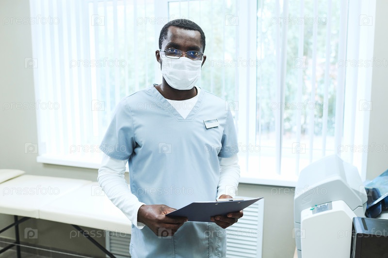 Портрет уверенного афроамериканского хирурга в маске и очках, стоящего с доской при анализе записей пациентов