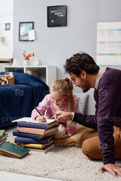 Молодой репетитор со стервями сидит на полу и изучает задания девочки, помогая ей готовиться к экзаменам в детской комнате