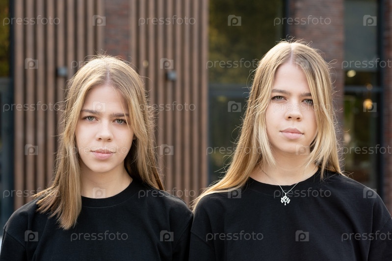 Близнецы-подростки в черных пуловерах смотрят на тебя