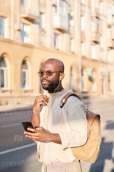 лысый молодой человек с гаджетом