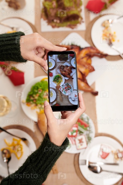 Женщина, фотографирующая рождественский ужин за столом