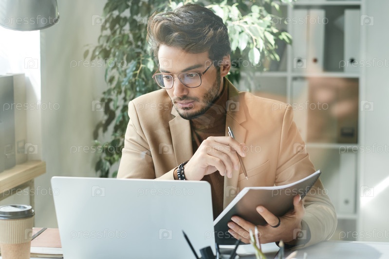 Серьезный молодой ближневосточный менеджер в очках сидит за столом и использует ноутбук, анализируя отчет в офисе