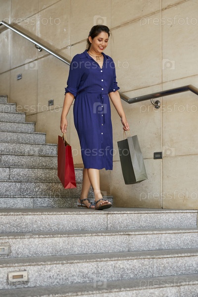 Женщина с сумками для покупок идет по лестнице