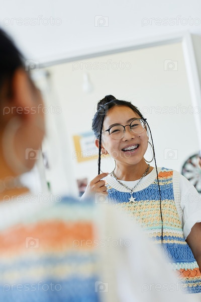 Улыбающаяся девочка-подросток смотрит в зеркало