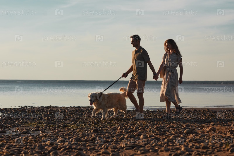Пара гуляет с собакой у озера на закате