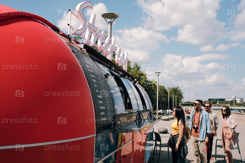 Группа клиентов просматривает меню, стоя у грузовика уличного питания
