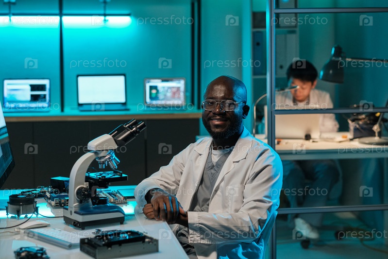 Счастливый молодой африканский ученый с микроскопом сидит на рабочем месте
