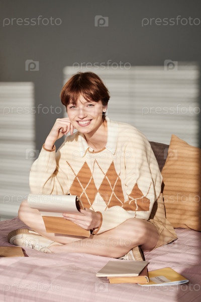 Портрет улыбающейся привлекательной студентки с рыжими волосами, сидящей со скрещенными ногами на кровати и читающей заметки в блокнот
