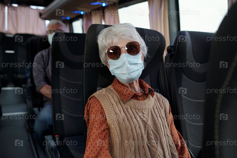 Сероволосая зрелая женщина в защитной маске едет на автобусе