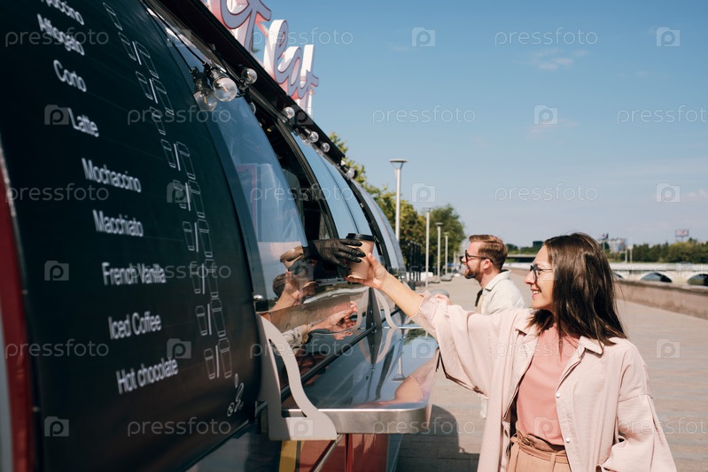Молодые люди покупают еду в уличных грузовиках летом