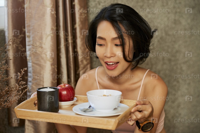 Взволнованная женщина с завтраковым подносом