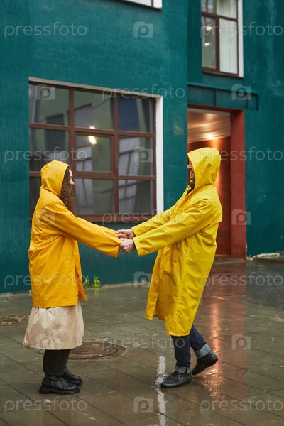 Пара в дождевых пальто, танцующая