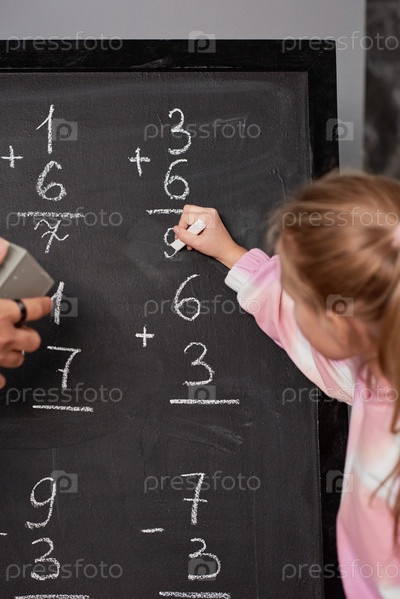 Девочка записывает математическое решение на доске во время подсчета чисел на школьном уроке