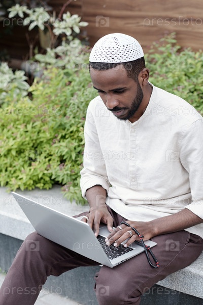 Загруженный мусульманин работает с ноутбуком