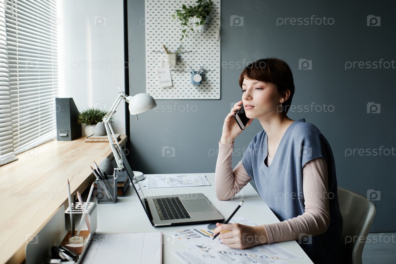 Вдумчивая молодая женщина звонит по телефону и редактирует графики, работая удаленно