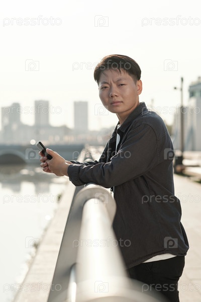 Молодая бизнесвумен азиатской этнической принадлежности смотрит на камеру снаружи
