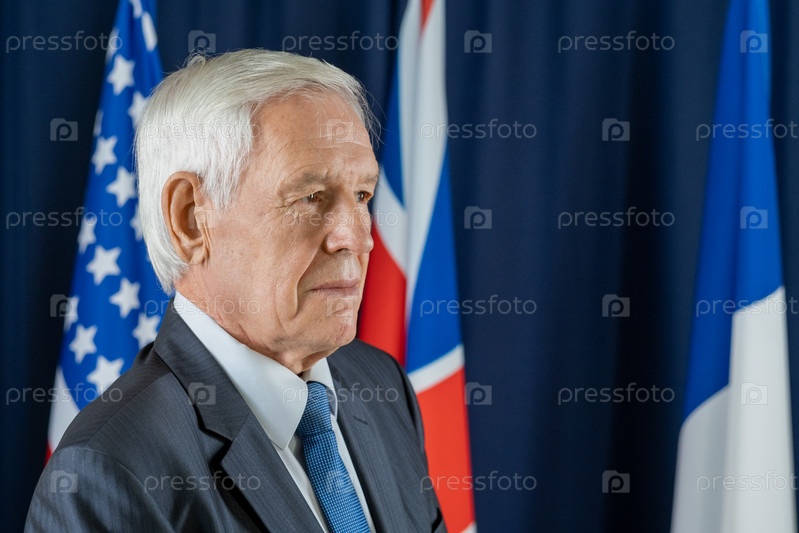 Пожилой делегат в формальной одежде стоит перед камерой