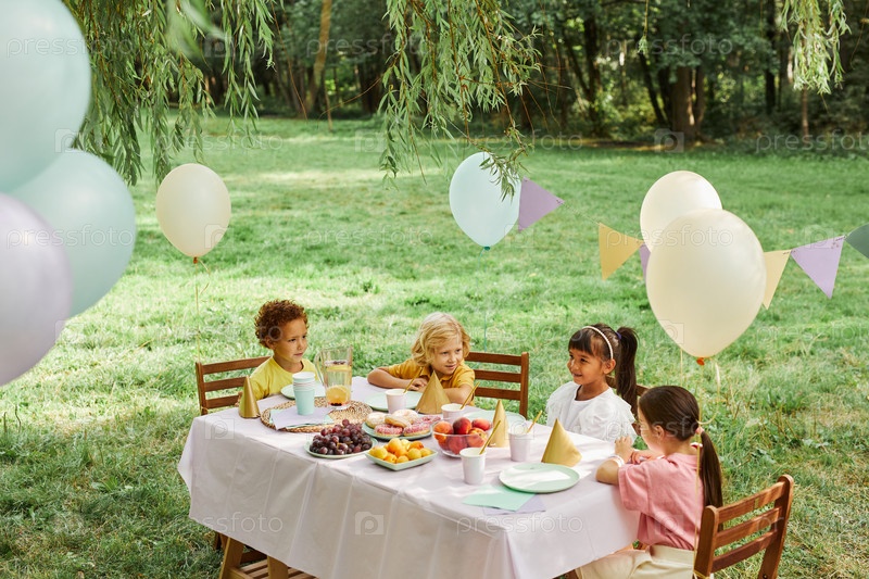 Дети на вечеринке по случаю дня рождения под открытым небом