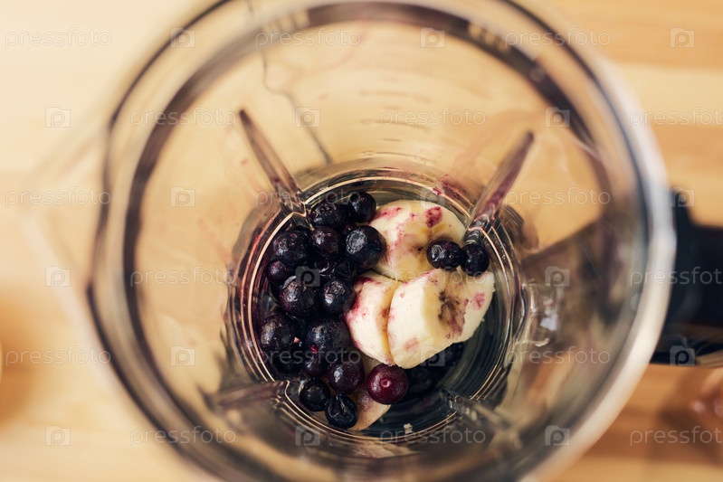 Свежие бананы и черники в электрическом блендере