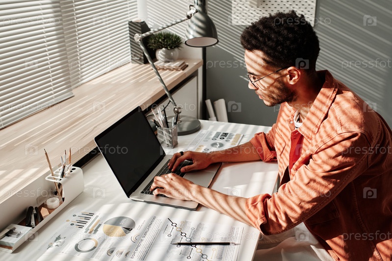 Серьезный молодой афроамериканский бизнесмен в очках сидит за столом против жалюзи и печатает на ноутбуке