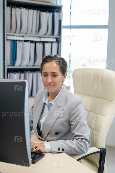 Молодая секретарша печатает перед компьютерным монитором