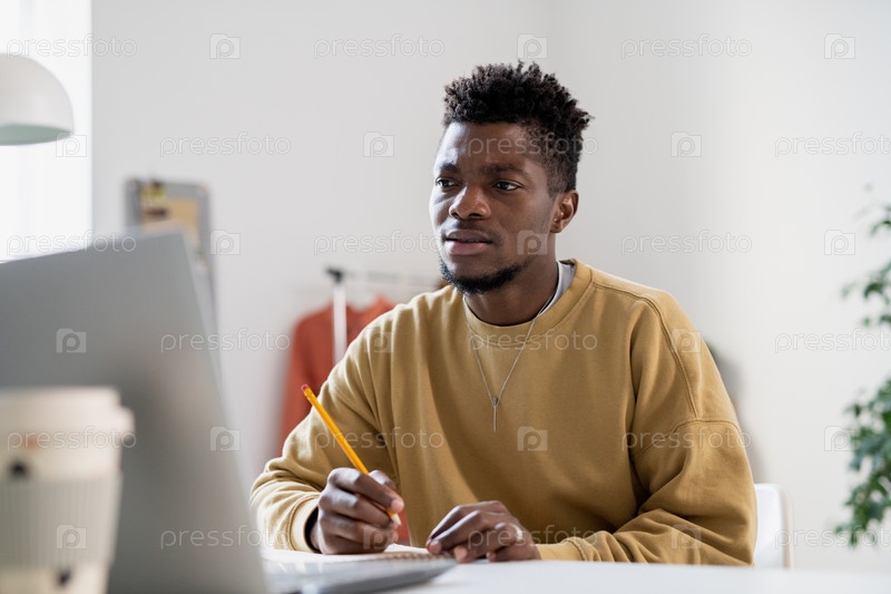 Напряженный молодой человек с карандашом смотрит на экран ноутбука