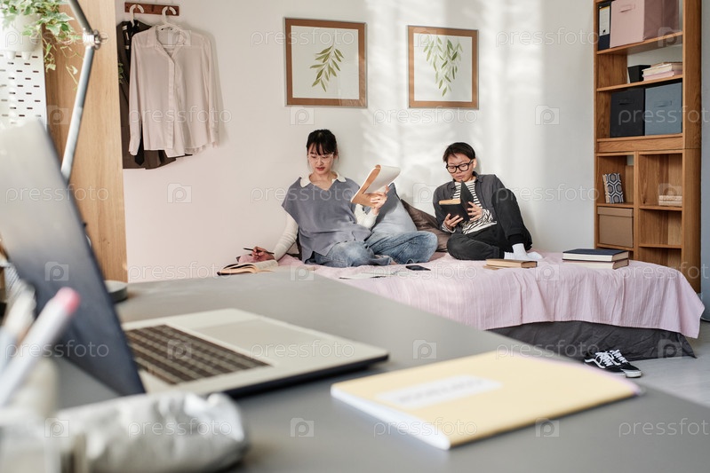 Концентрированная молодая азиатская студенческая пара, сидящая на кровати и читающая книги во время подготовки к экзамену в уютной комнате