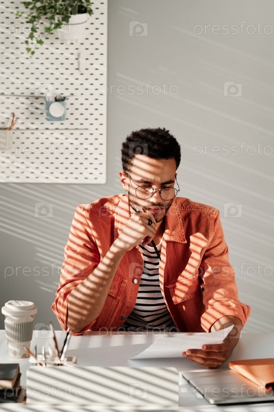 Серьезный молодой эксперт смешанной расы по очкам, сидящий за столом и держащий карандаш во время работы с бумагами