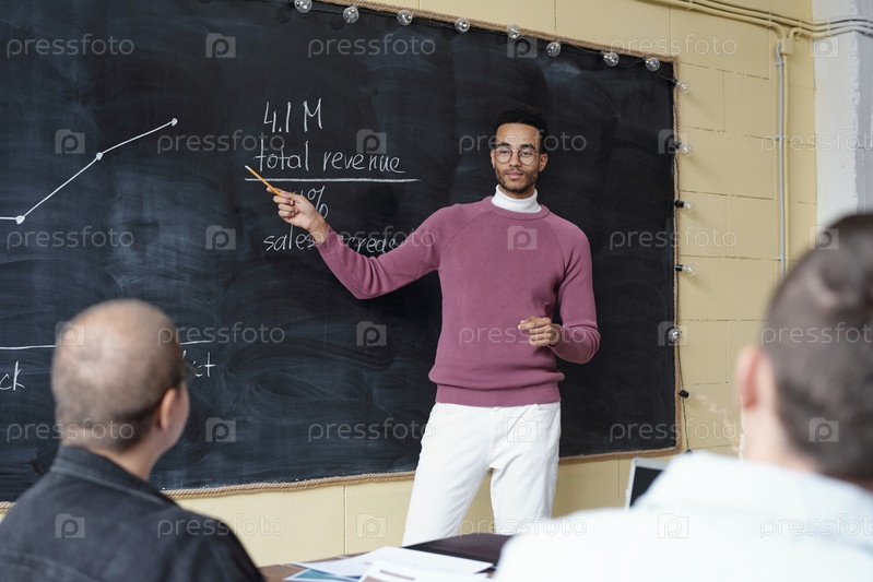 Молодой современный экономист или тренер, объясняющий график на доске