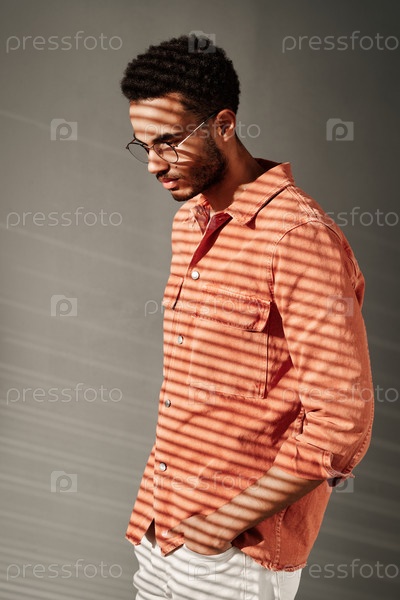 Вдумчивый стильный молодой чернокожий мужчина с бородой, носящий коралловую рубашку и очки, держась за руки в карманах джинсов