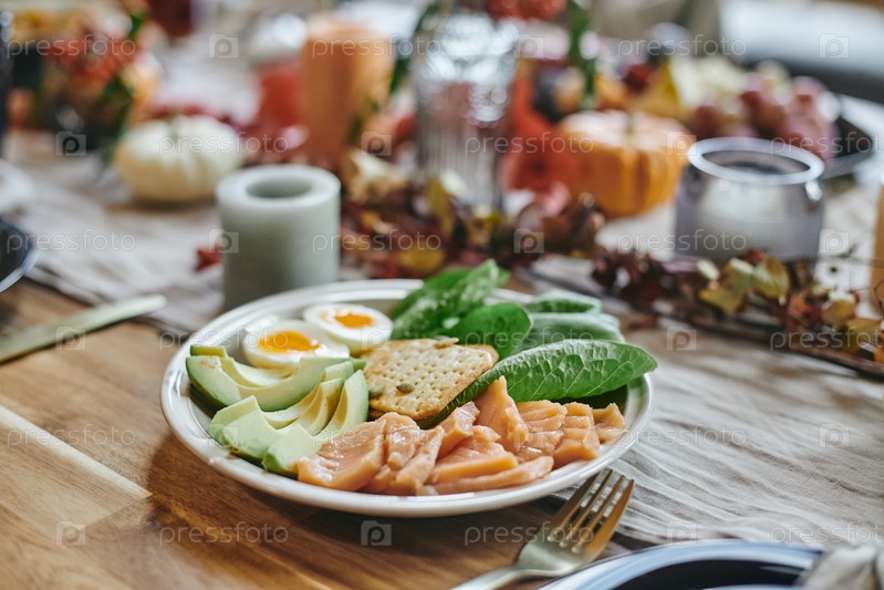 Тарелка с нарезанным свежим авокадо, листьями шпината, наполовину сваренными яйцами, печеньем и измельченной рыбой