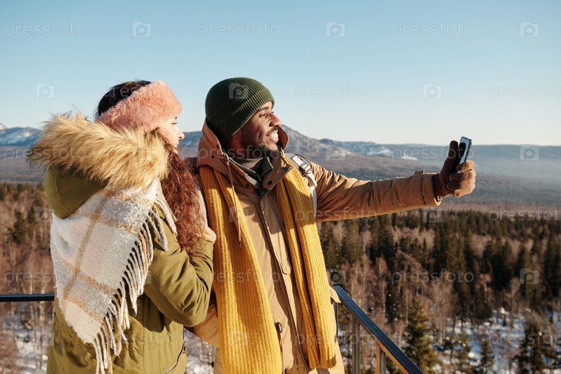 Многорасовые свидания делают селфи во время путешествия в зимнем курорте