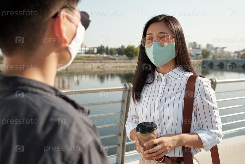 Молодая азиатская женщина с напитком, разговаривающая с коллегой