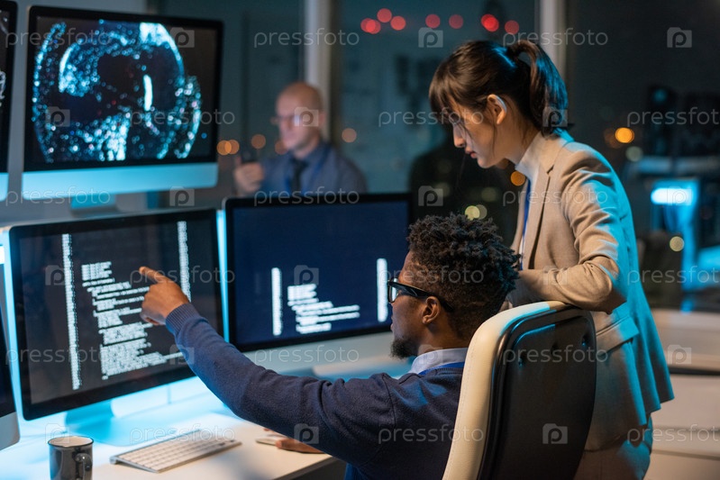 Уверенный бизнесмен указывает на зашифрованные данные на экране компьютера