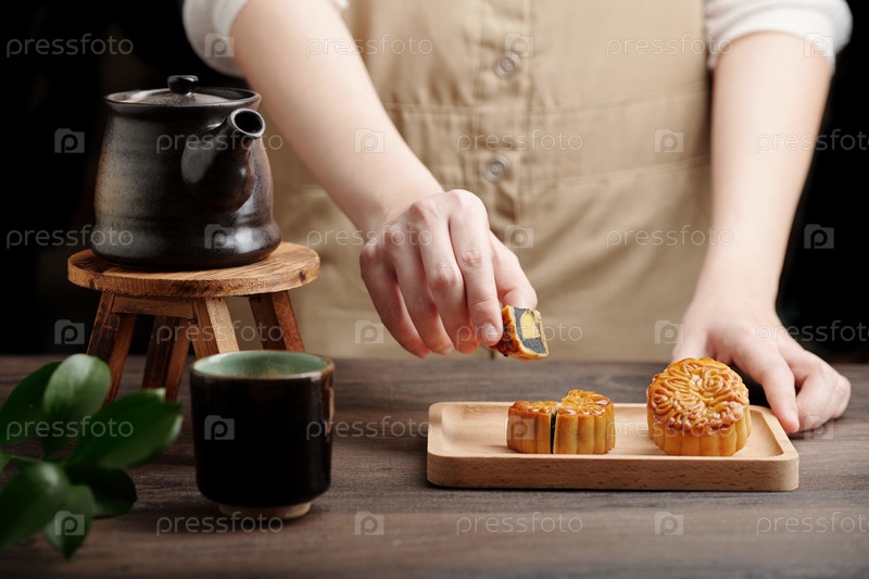 Женщина, режущая чай с заполнением черным кунзамом