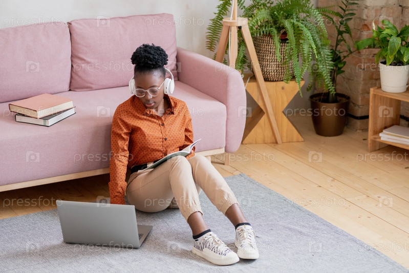 Молодая серьезная чернокожая женщина в повседневной одежде и наушниках сидит на полу перед ноутбуком