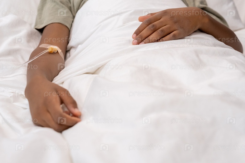 Маленький мальчик с капельницей в руке лежит в постели